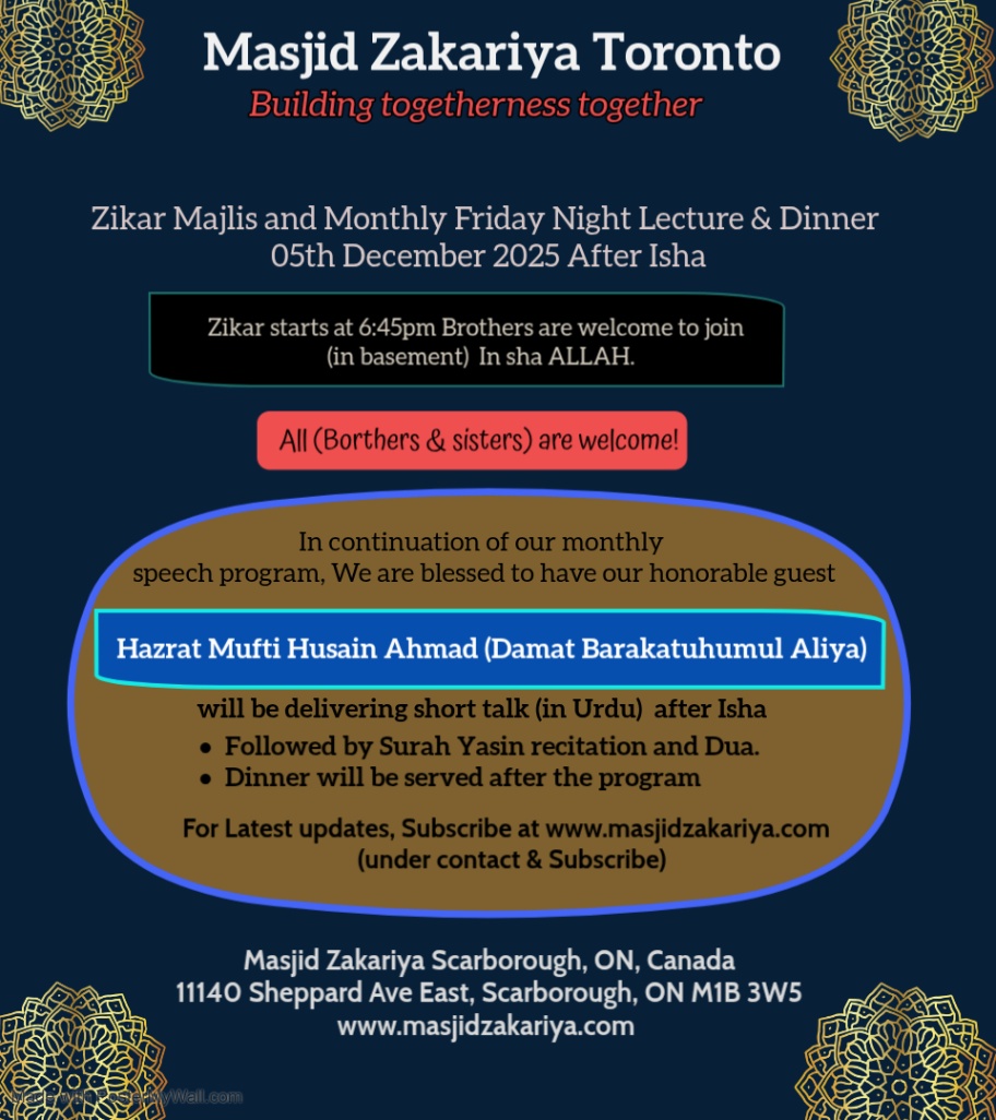 Zikar Majlis and Monthly Friday Night Lecture & Dinner Friday 07 November 2025 After Isha Brothers are welcome to join for Zikr at 6:45pm (In basement) In sha ALLAH Assalamu-Aleykum Brothers and Sisters In continuation of our monthly speech program Shaikh Moulana Mohammad Zakariya Patel(Damat Barakatuhum) will be delivering short talk (in English / Urdu Translation available in the back if required) on Friday 07 November After Isha Salah. Followed by Surah Yasin recitation and Dua. All are welcome! Dinner will be served after the program. For Latest updates, Join Masjid Zakariya WhatsApp Group and/or Subscribe at www.masjidzakariya.com (under contact & Subscribe) https://masjidzakariya.ad-din.site/Pages/view/281 Masjid Zakariya Scarborough Building togetherness together https://mailchi.mp/b4db3f77f03a/zikar-majlis-and-monthly-friday-night-lecture-dinner-friday-07-november-2025-after-isha-14194265 Subscribe to Masjid Zakariya Updates https://masjidzakariya.ad-din.site/Pages/view/282 https://portal.ad-din.ca/public/largedisplayhorizontal/359 Masjid TV Prayer Times Dashboard view on Phone View Landscape mode or rotate your phone